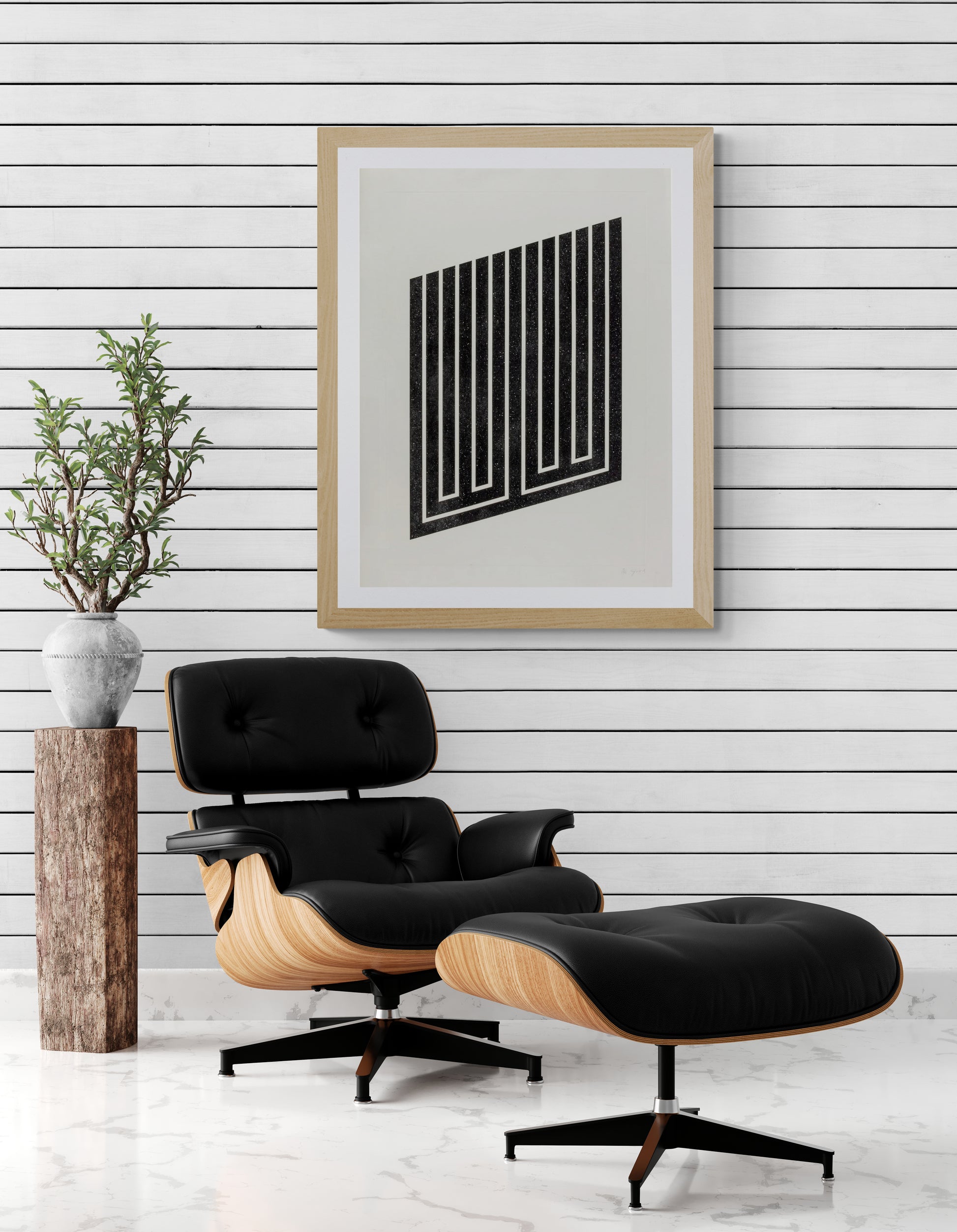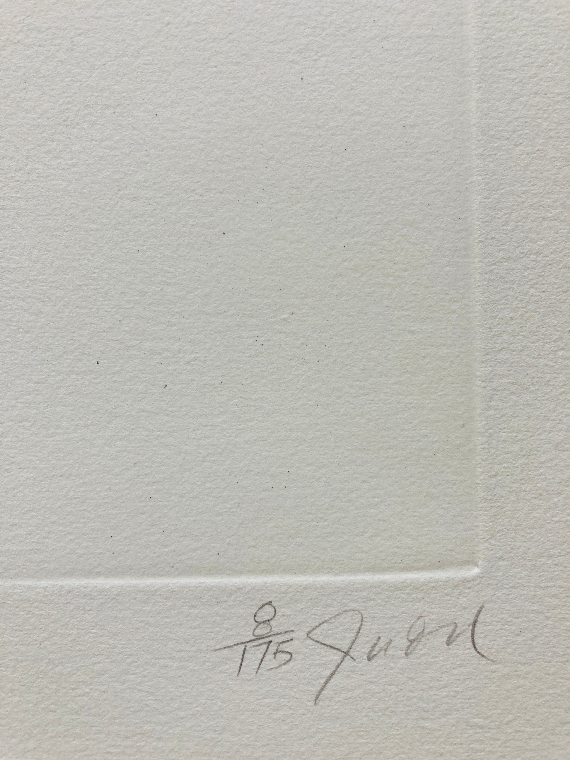 This aquatint is from the 1978-79 untitled set of 15 aquatints in black (Schellmann 87-101), in which Judd explored different permutations of unprinted white paper lines against a black aquatinted parallelogram shape. The format is one familiar from two of his earliest series of woodcuts begun in 1961, one printed in cadmium red (Schellmann 37-62) and the other in cerulean blue (Schellmann 63-74). He later returned to this format in a series of 27 line etchings begun in 1983 (Schellmann 126-152).