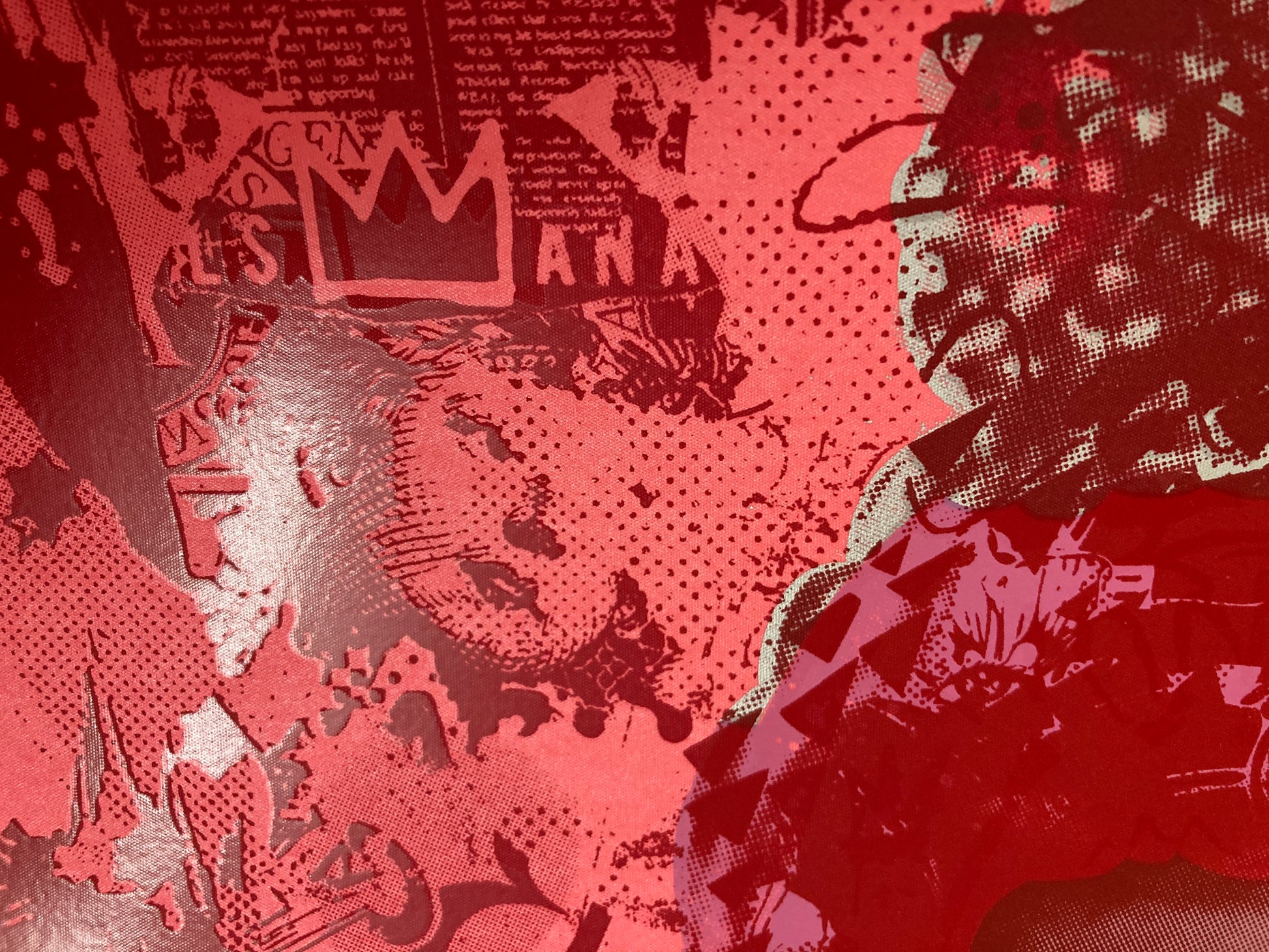 Screenprint in 6 colors with deluxe metallic inks on 310 gsm Vicious Pink specialty paper